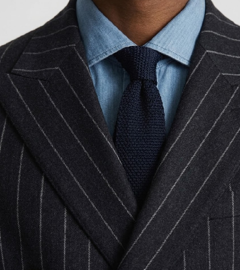 Every element of this two-piece ensemble has been meticulously considered to offer a cohesive and refined look, from the dramatic peak lapels to the clean, streamlined finish of the jacket and trousers. The deep onyx tones provide a sophisticated canvas that pairs beautifully with the featured blue denim-style shirt, solid navy silk tie, and polished black leather tassel loafers, allowing for a personalized look that exudes unshakeable, quiet confidence. Suit Heritage also provides bespoke suiting services for a personalized experience, ensuring every detail of your Ashford suit is tailored precisely to your unique measurements and stylistic vision. Invest in a garment that defines contemporary elegance and serves as a standout cornerstone of your refined formal collection.