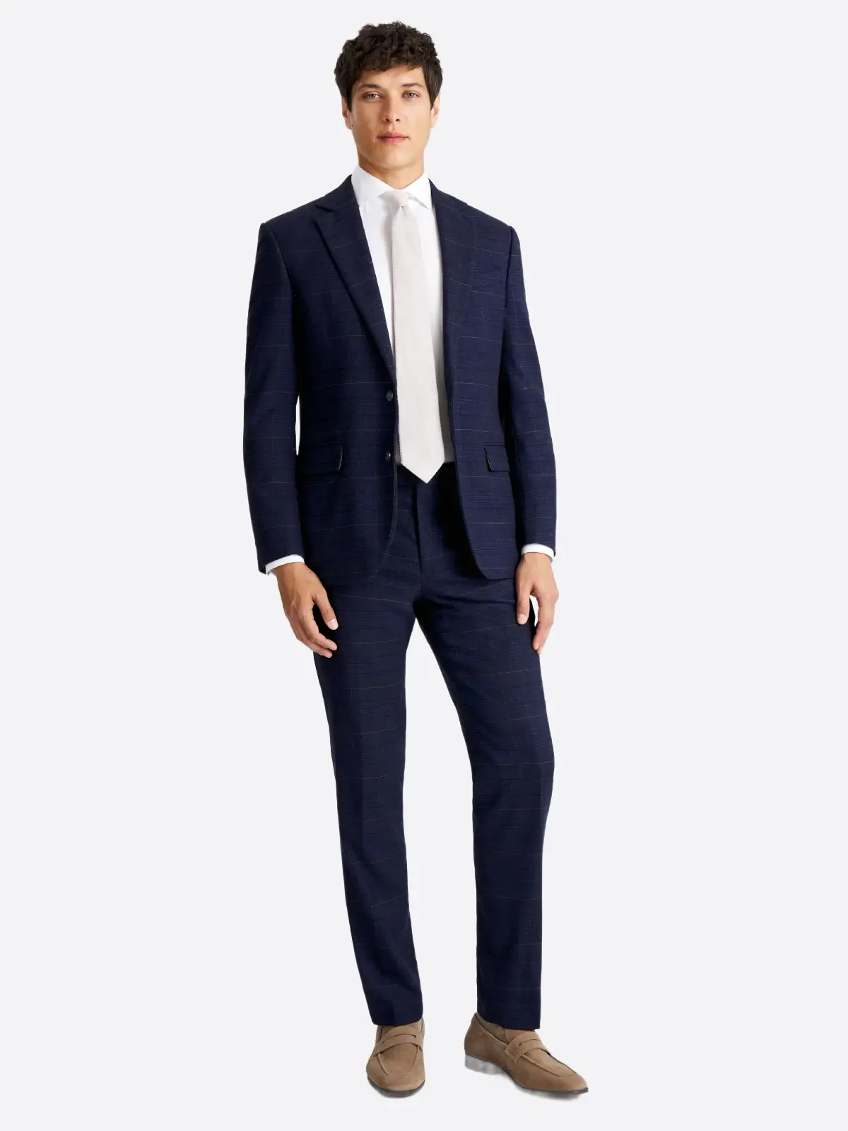 Tailored in a regular fit, this two-piece set is designed with a more generous cut through the chest, shoulders, and waist, ensuring a classic silhouette that prioritizes comfort and ease of movement. The single-breasted jacket features traditional notch lapels and a clean two-button closure, paired with matching straight-leg trousers for a balanced and professional finish. The intricate plaid weave catches the light to reveal high-definition detail, while the navy base maintains a grounded, authoritative presence. Elevate your wardrobe with this Suit Heritage essential, where iconic patterns meet the reliability of a timeless, comfortable fit.