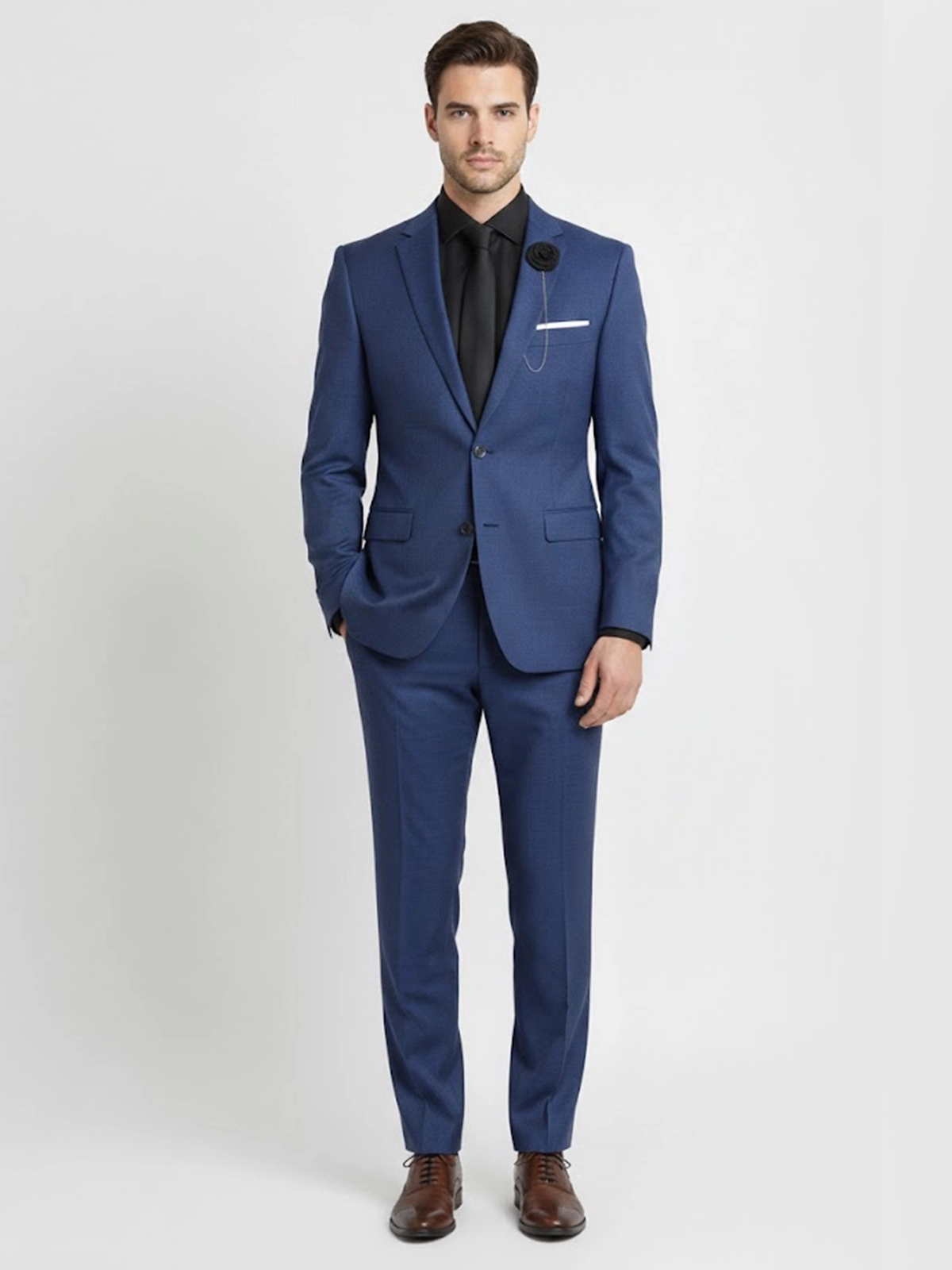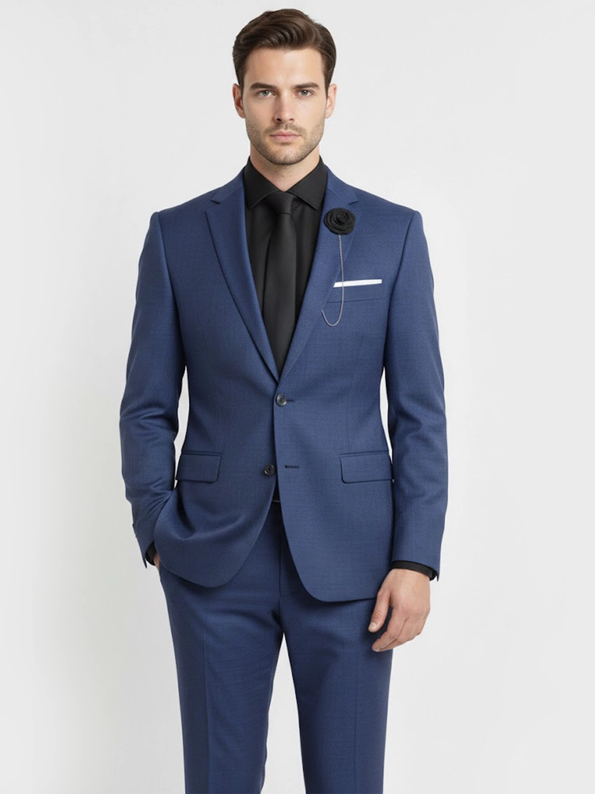 The Suit Heritage Men's Solid Dark Blue Regular Fit 2 Piece Suit represents a harmonious blend of traditional sartorial excellence and modern aesthetic appeal. This ensemble is defined by its deep, saturated blue hue, which provides a more vibrant and energetic alternative to standard navy while maintaining an air of professional decorum. The jacket is masterfully structured with classic notch lapels and a streamlined two-button front, creating a silhouette that commands respect in the boardroom and exudes elegance at formal celebrations. Every element of this suit is a reflection of the Suit Heritage commitment to quality, ensuring that the wearer feels as confident as they look.
